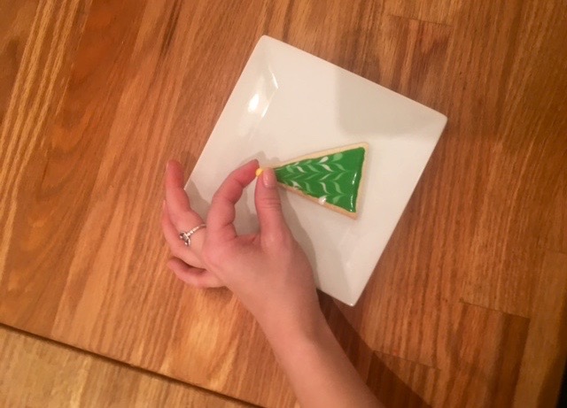 - For our triangles – to create Christmas Trees, outline cookie with green icing and then fill with thin layer.
