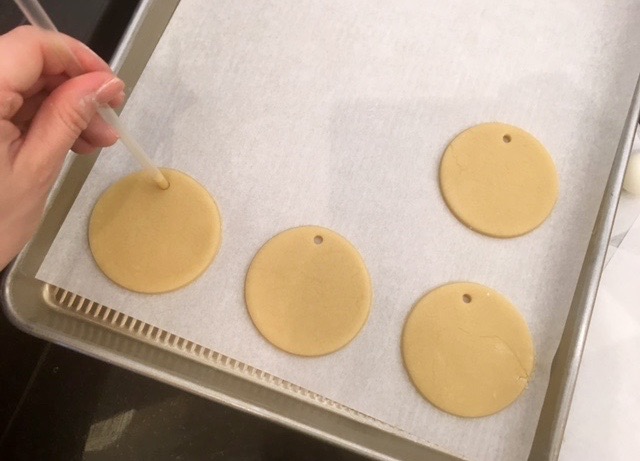- Use a straw to make small holes at the top of ornaments (that you can string yarn through when they are done).