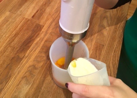 - Once your butter is melted, begin blending your egg yolks with the immersion blender, slowly adding in a little melted butter at a time as you blend.